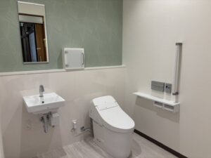 (壁には淡いグリーンのアクセントクロス、床は防滑仕様の長尺シート)